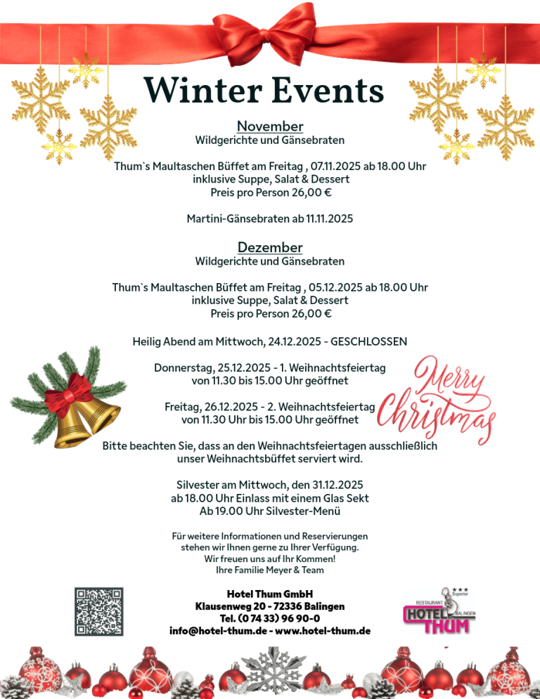 Es kommt die Zeit der Besinnlichkeit und der Einkehr. Wir möchten Sie schon jetzt daran erinnern, rechtzeitig Ihre Weihnachtsfeier bei uns zu buchen, denn die Plätze sind begrenzt.